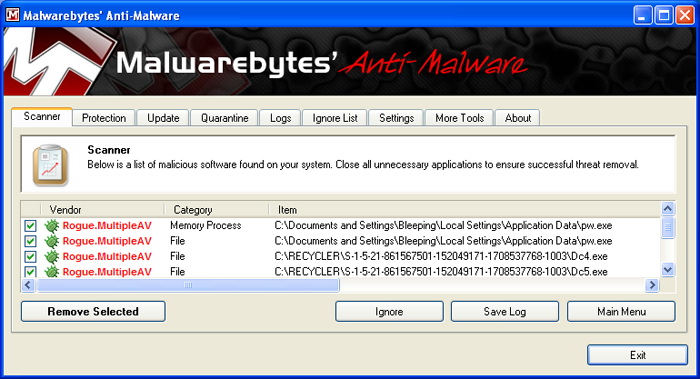 • A screen displaying all the malware that the program found will be shown as seen in the image below. Please note that the infections found may be different than what is shown in the image.